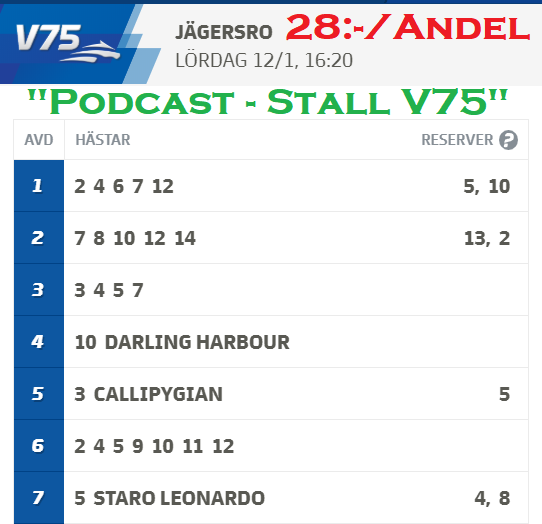 Nytt Podavsnitt där jag Johan Ulvestål bjuder på mina tankar och idéer kring V75 som avgörs på Jägersro under lördagen. Ta del av: – Spikarna – Dragen – Skrällarna Vill Ni läsa eller lyssna mer om mig så finns jag https://minandel.se/