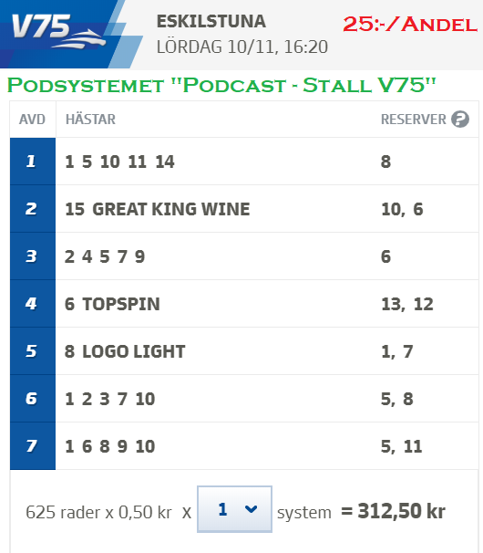 Nytt Podavsnitt där jag Johan Ulvestål bjuder på mina tankar och idéer kring lördagens V75 på Sundbyholmstravet som kryddas med en MULTIJACKPOT på hela 120 miljoner. Ta del av: – Spikarna – Dragen – Skrällarna