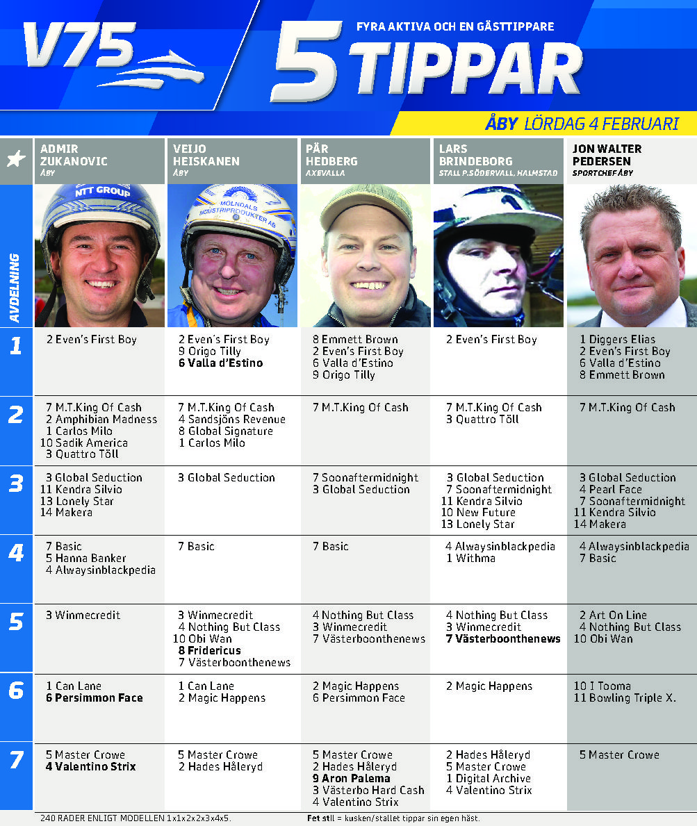 Hingsten Fem tippar V75 till Åby 4 februari 2017 Publicerat 30 januari, 2017 Fem tippar V75 till Åby 4 februari 2017