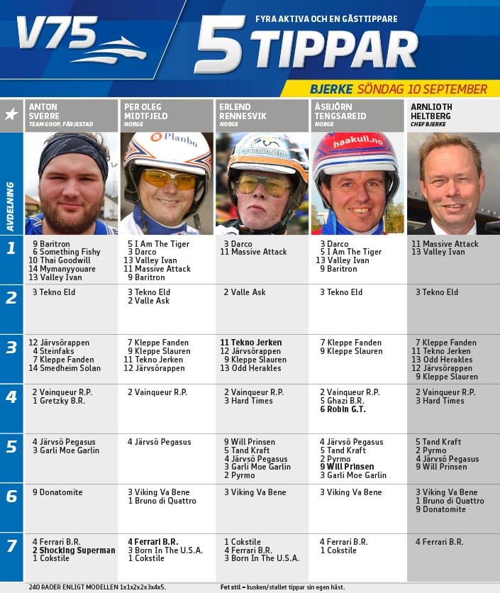 Hingsten Fem tippar V75 till Bjerke 10 september 2017 Publicerat 9 september, 2017 Fem tippar V75 till Bjerke 10 september 2017