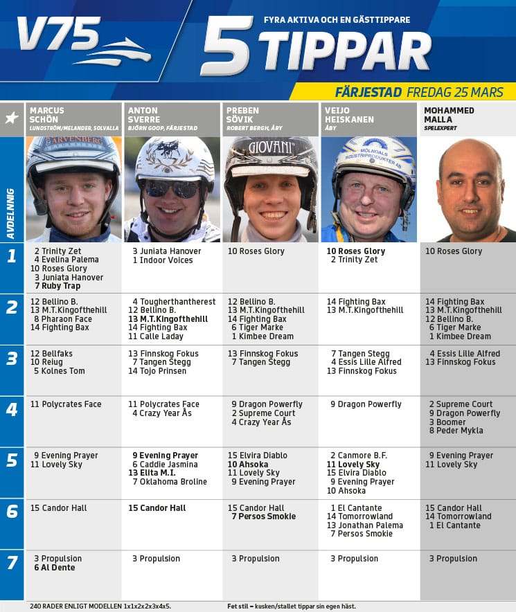 Hingsten Fem tippar V75 till Färjestad 25 mars Publicerat 24 mars, 2016 Fem tippar V75 till Färjestad 25 mars