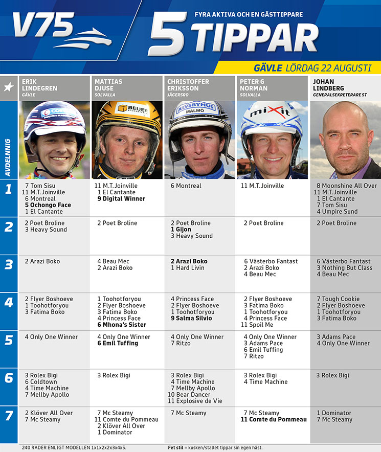 Hingsten Fem tippar V75 till Gävle 22 augusti Publicerat 19 augusti, 2015 Fem tippar V75 till Gävle 22 augusti