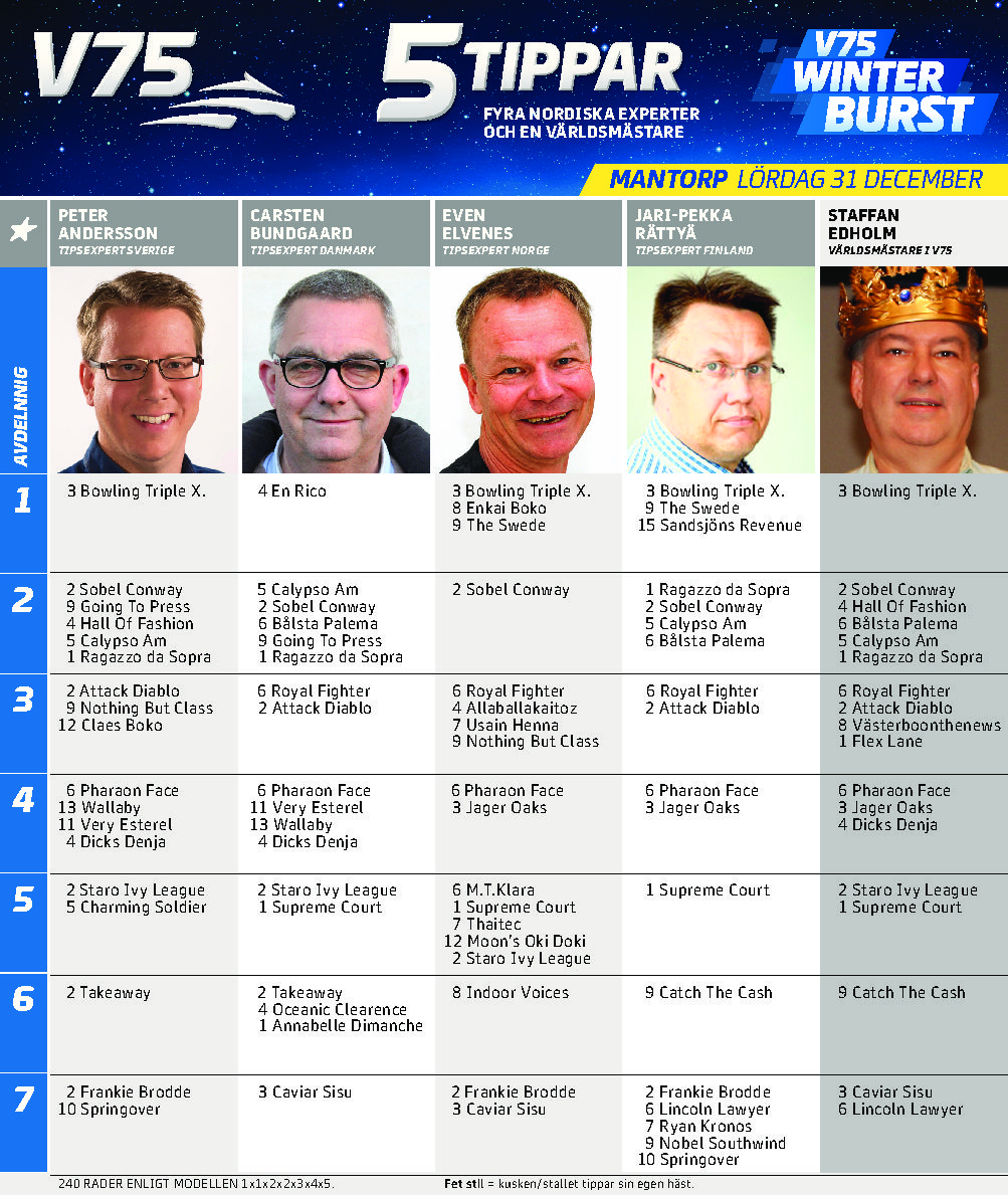 Hingsten Fem tippar V75 till Mantorp 31 december Publicerat 30 december, 2016 Fem tippar V75 till Mantorp 31 december