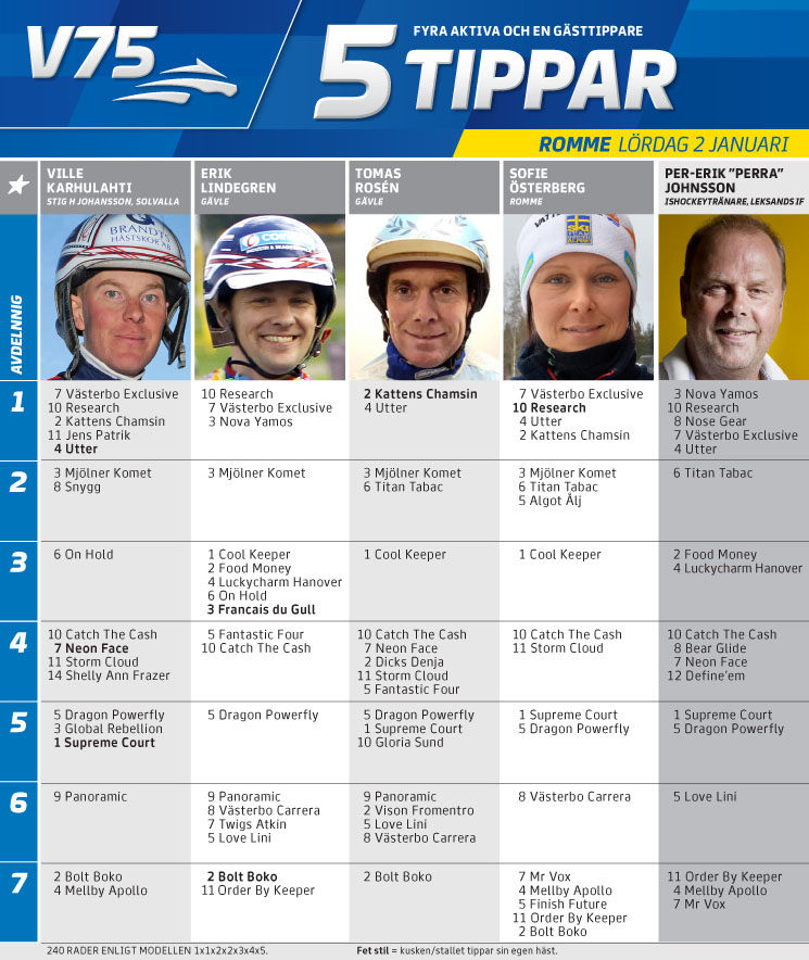 Hingsten Fem tippar V75 till Romme 2 januari Publicerat 29 december, 2015 Fem tippar V75 till Romme 2 januari
