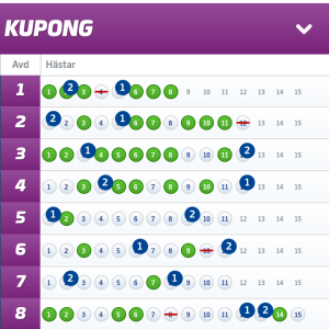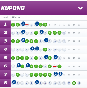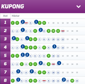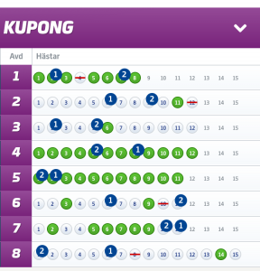 2. ”Inlämnat Solklart”, 200:-/andel: Hade nypremiär för ett par månadader sedan där taktiken är att gardera samtliga avdelningar d.v.s att jag INTE har någon spik. Detta system tror jag MYCKET på inför framtiden och har presterat mycket bra sedan starten – fick full pott på V75 i söndags och har dessutom haft full pott på V86 vid två tillfällen denna månaden. Har nosat på de riktigt höga slantar under en lång tid – så snart smäller det rejält.